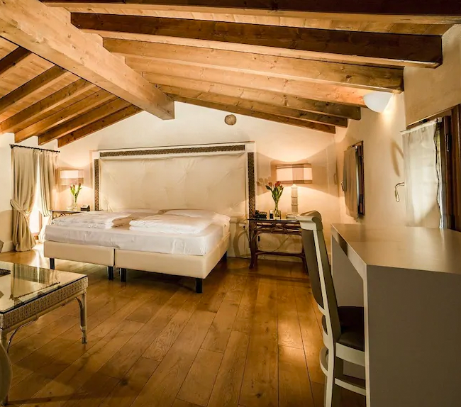 Le camere di Borgo Machetto sono tutte arredate con tinte neutre e moderne in abbinamento al calore del legno che caratterizza ogni stanza.